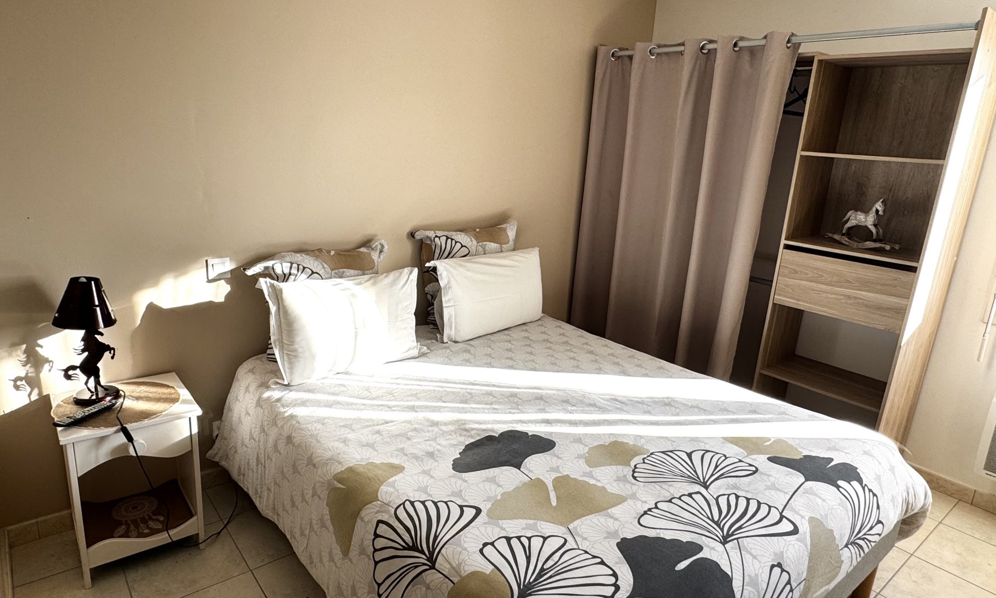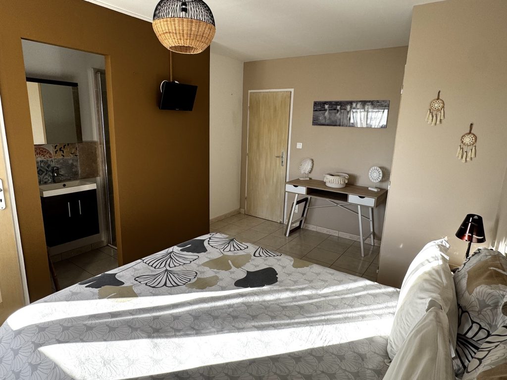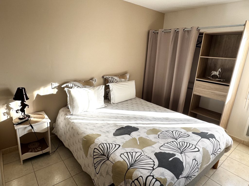 La chambre Cheval vous propose un lit en 160 avec salle d’eau et WC individuel, une armoire de rangement avec penderie ainsi qu’une Télévision.